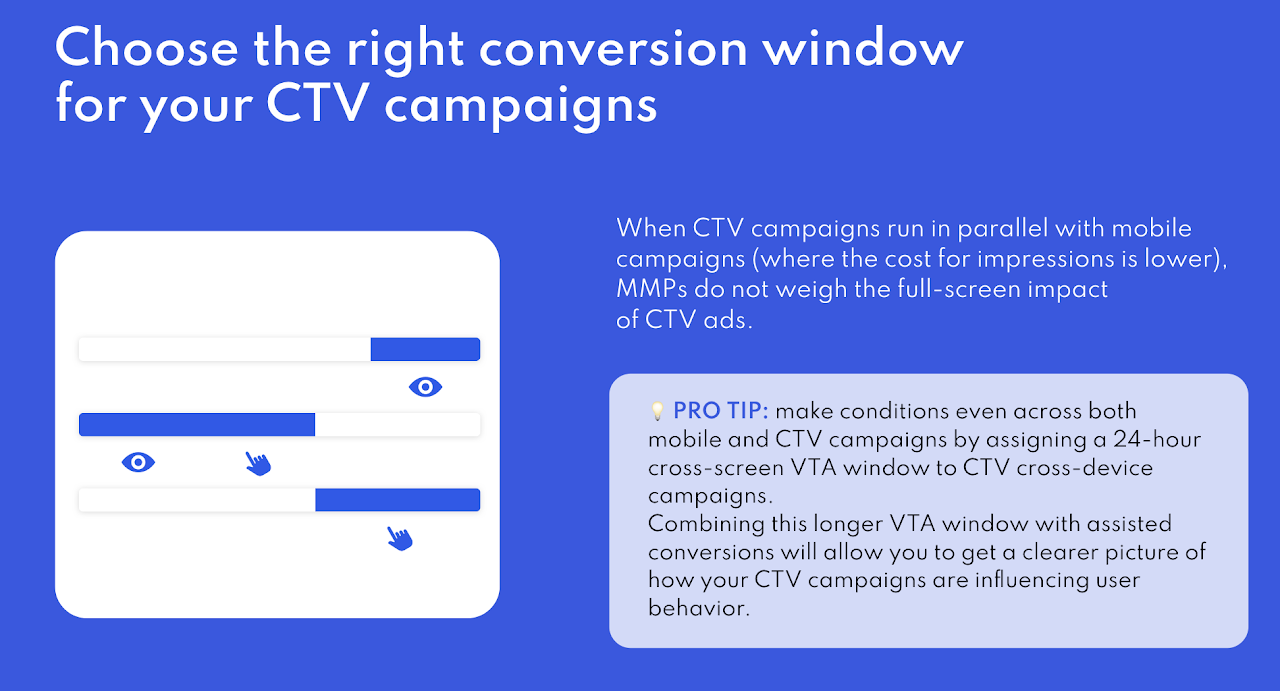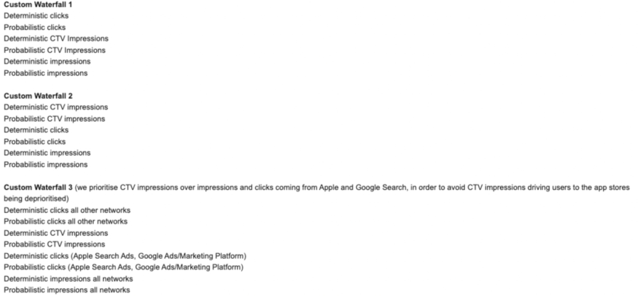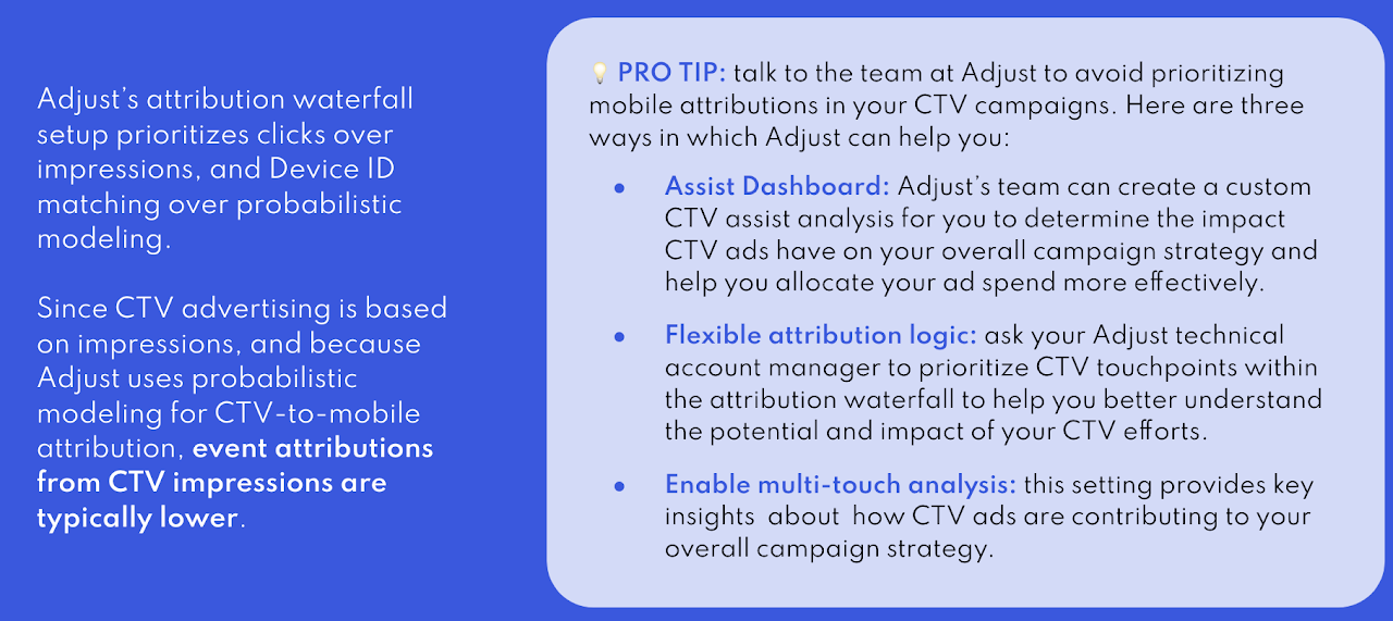 Flexible attribution logic allows to prioritize CTV touchpoints within the attribution waterfall, letting you better understand the impact of campaigns. (This needs to be requested to your Adjust technical account manager).