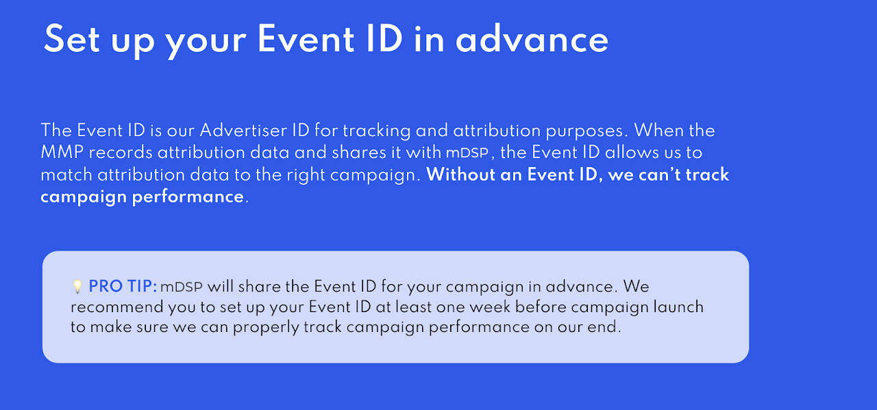 The Event ID is our Advertiser ID for tracking and attribution purposes. When the MMP records attribution data and shares it with mDSP, the Event ID allows us to match attribution data to the right campaign.