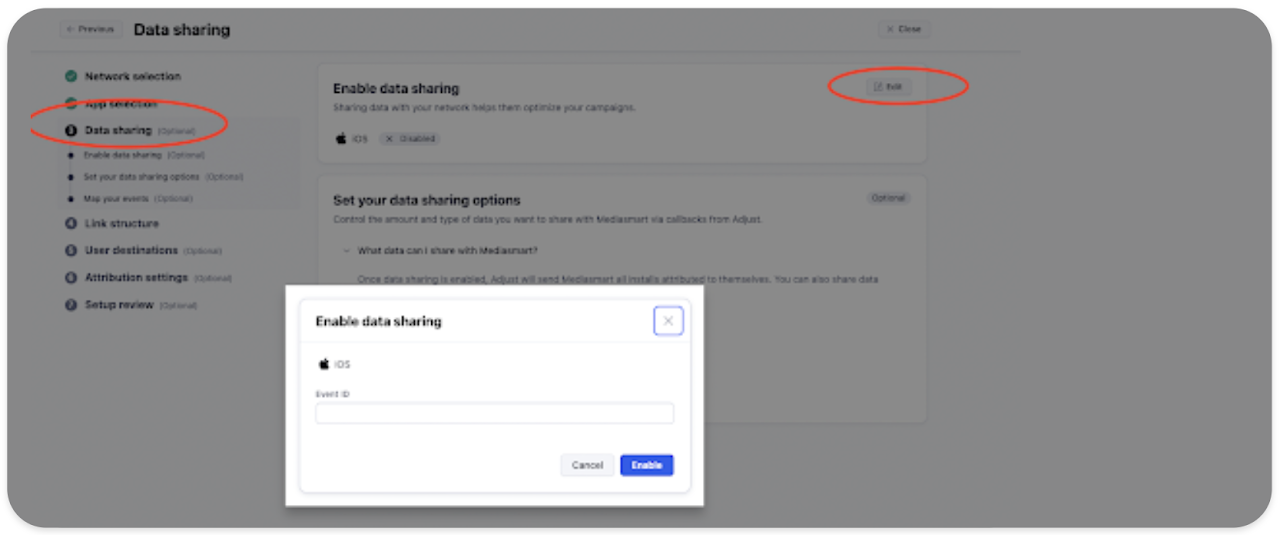 Within the “Data sharing” section, under the “Enable data sharing” title, click on “Edit” and add the Event ID that mDSP will share with you.