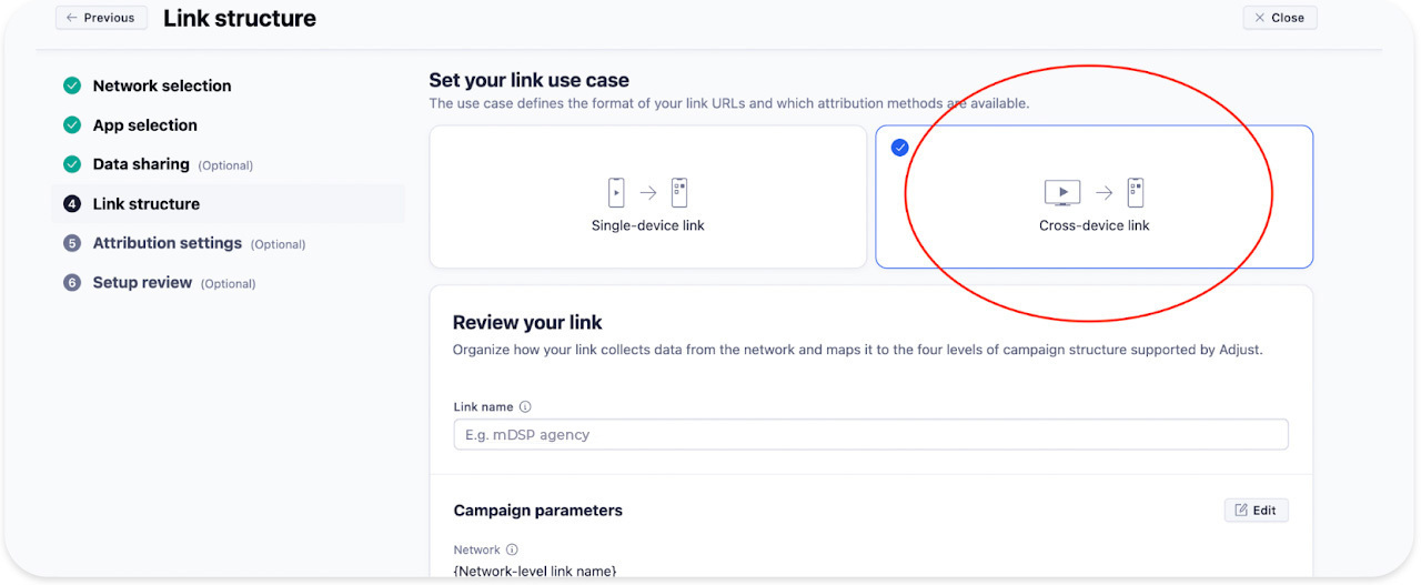 Go to the “Link structure” section and, under the “Set your link use case” title, select the “cross-device link” option. Then, click on “next”.