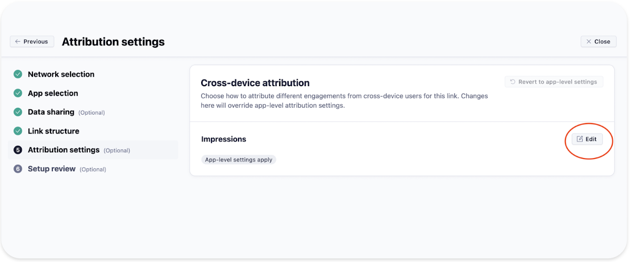 Go to the “Attribution settings” section and, under the “Cross-device attribution” title, click on “Edit”.